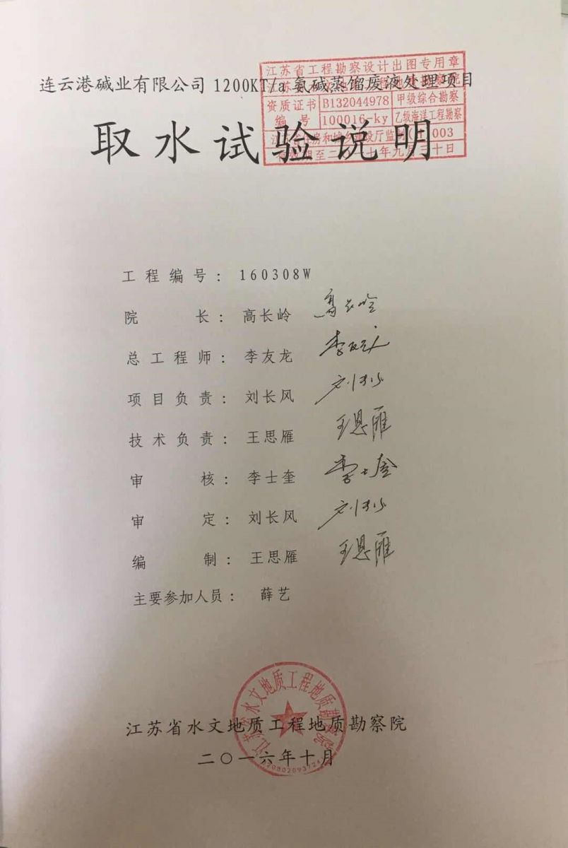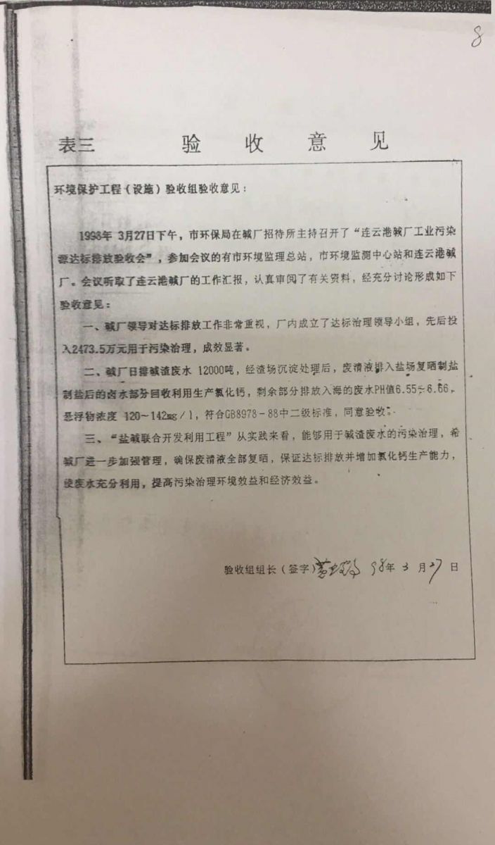 根據吉林化學(xué)工業(yè)公司設計院《連云港堿廠(chǎng)環(huán)境影響報告書(shū)》和原江蘇省環(huán)境保護局《關(guān)于對連云港堿廠(chǎng)環(huán)境影響報告書(shū)的批復》(蘇環(huán)管〔86〕31號)的要求,連云港堿廠(chǎng)產(chǎn)生的廢液送至渣場(chǎng),經(jīng)澄清后,上清液經(jīng)自有排口閘直接排海。1997年,根據淮河流域水污染防治的要求,連云港市環(huán)保局向連云港堿廠(chǎng)下達了《關(guān)于淮河流域水污染源限期達標排放的決定》(連環(huán)管〔1997〕16號)。據此,連云港堿廠(chǎng)與臺北鹽場(chǎng)合作開(kāi)發(fā)了“堿渣場(chǎng)上清液回收利用工程”項目,利用上清液制鹽、制鈣。1998年3月27日,該項目通過(guò)連云港市環(huán)保局組織的環(huán)保驗收,正式運行。