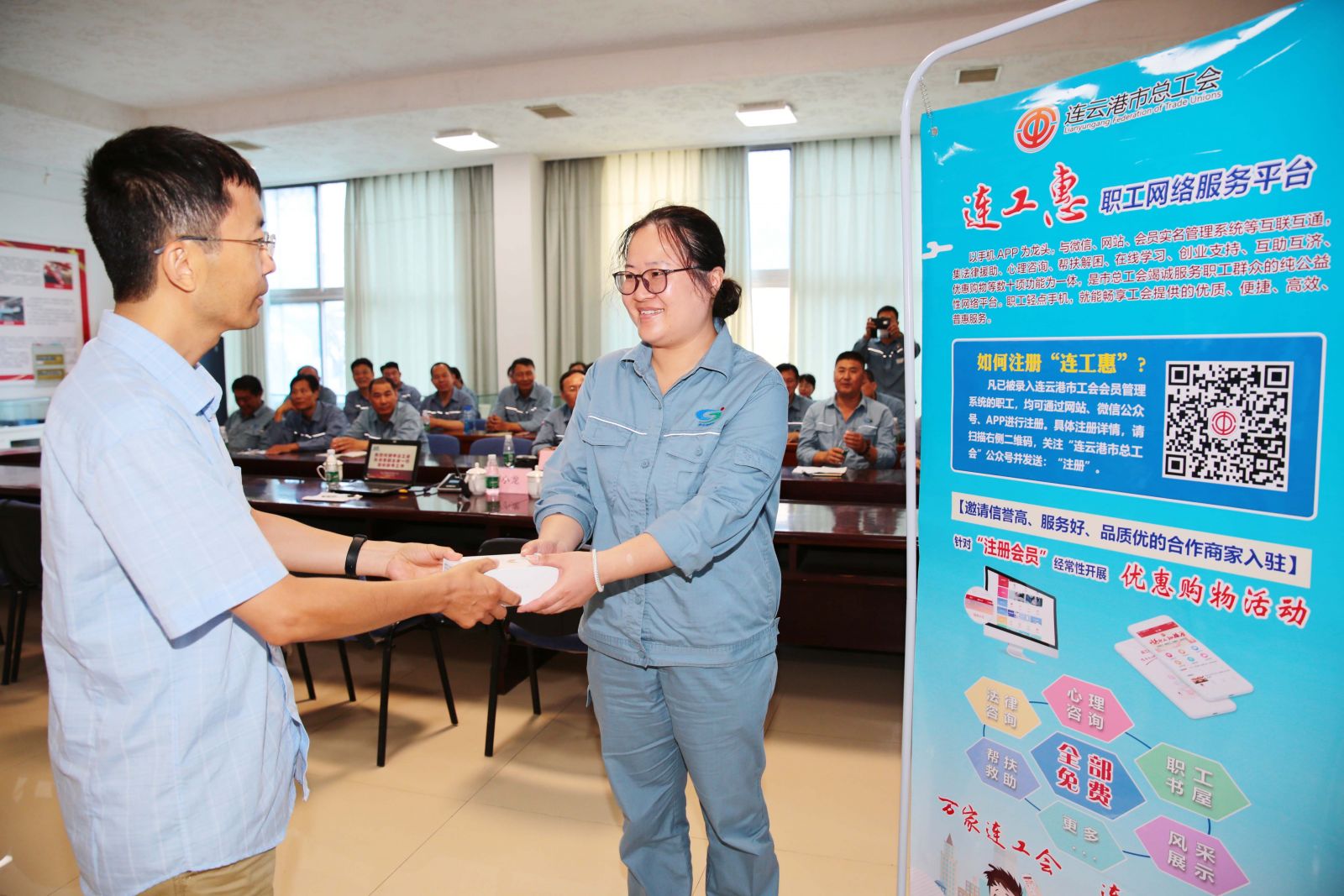 此次調研,孫月春副主席一行帶來(lái)三百余冊圖書(shū)贈予公司職工書(shū)屋,進(jìn)一步豐富了公司職工的業(yè)余文化生活,并向參加連工惠抽獎活動(dòng)獲獎的我公司職工伏廣偉頒獎。連工惠運營(yíng)人員針對“連工惠”平臺注冊相關(guān)事宜進(jìn)行了面對面指導,并一一解答了現場(chǎng)參會(huì )人員提出的問(wèn)題。