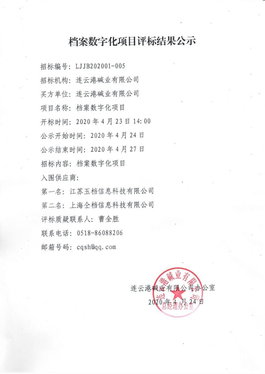 連云港堿業(yè)有限公司檔案數字化項目評標結果公示