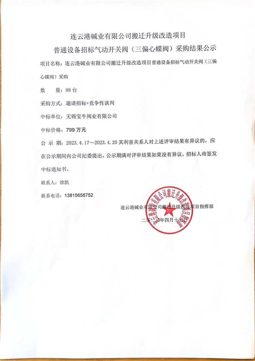 氣動(dòng)開(kāi)關(guān)閥(三偏心蝶閥)采購結果公示
