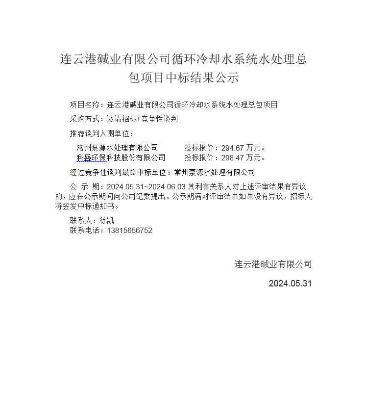 連云港堿業(yè)有限公司循環(huán)冷卻水系統水處理總包項目中標結果公示