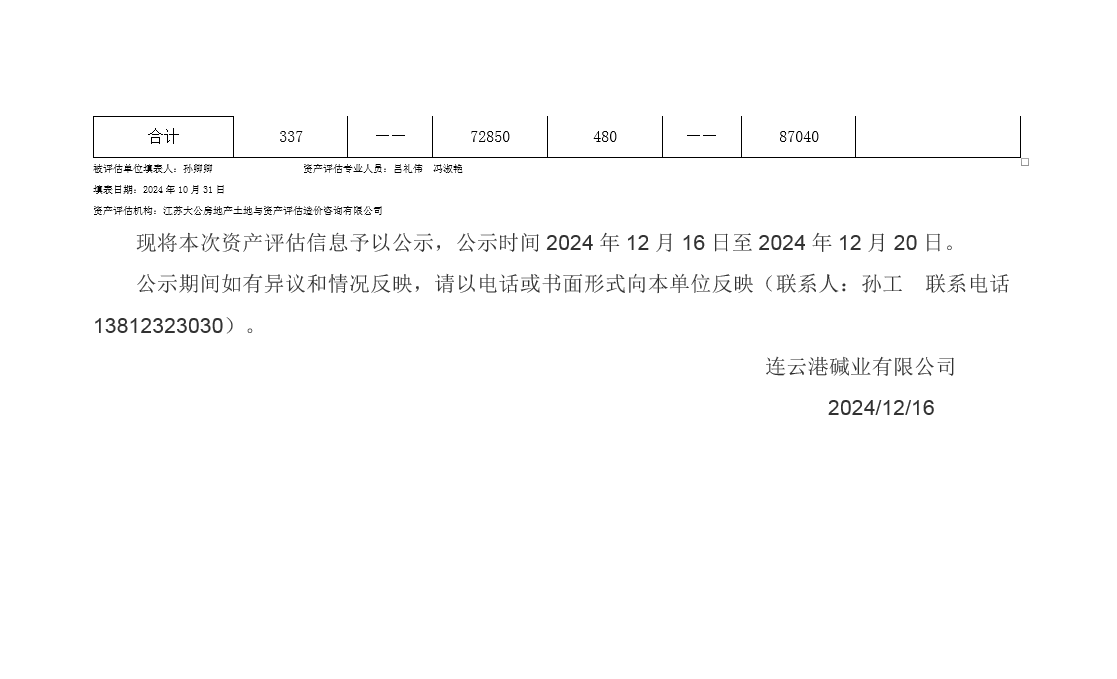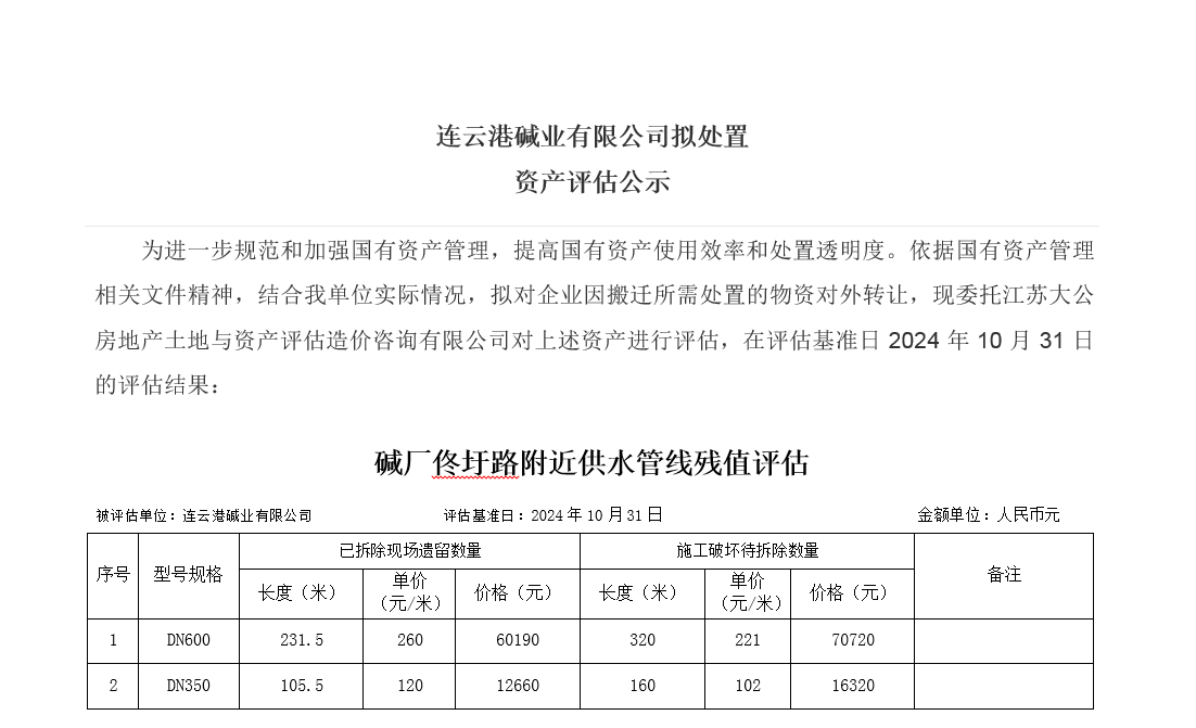連云港堿業(yè)有限公司佟圩路附近供水管線(xiàn)資產(chǎn)評估公示