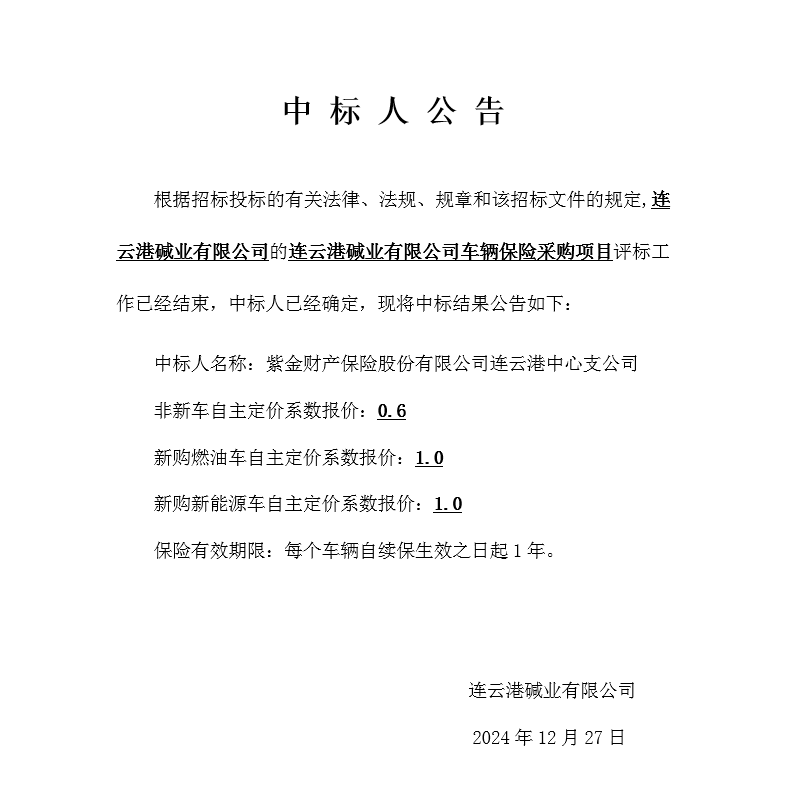 連云港堿業(yè)有限公司車(chē)輛保險采購項目中標人公告