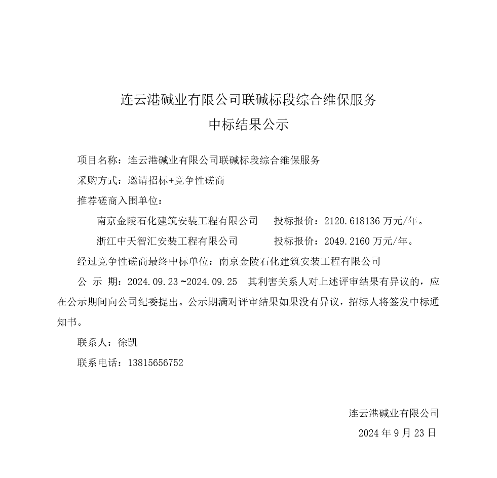 聯(lián)堿標段綜合維保服務(wù)中標結果公示