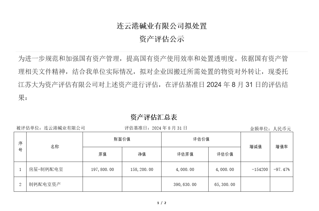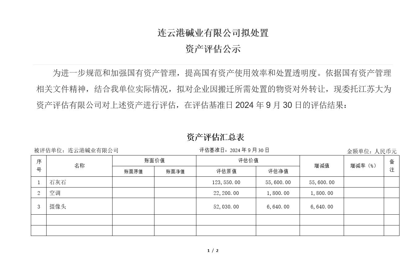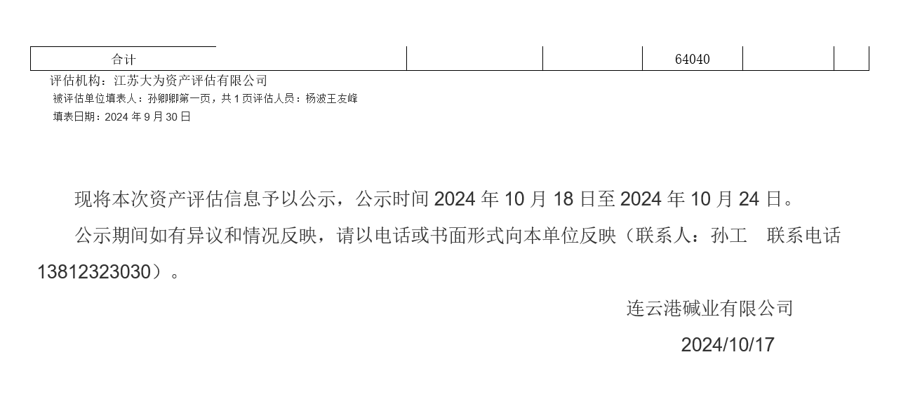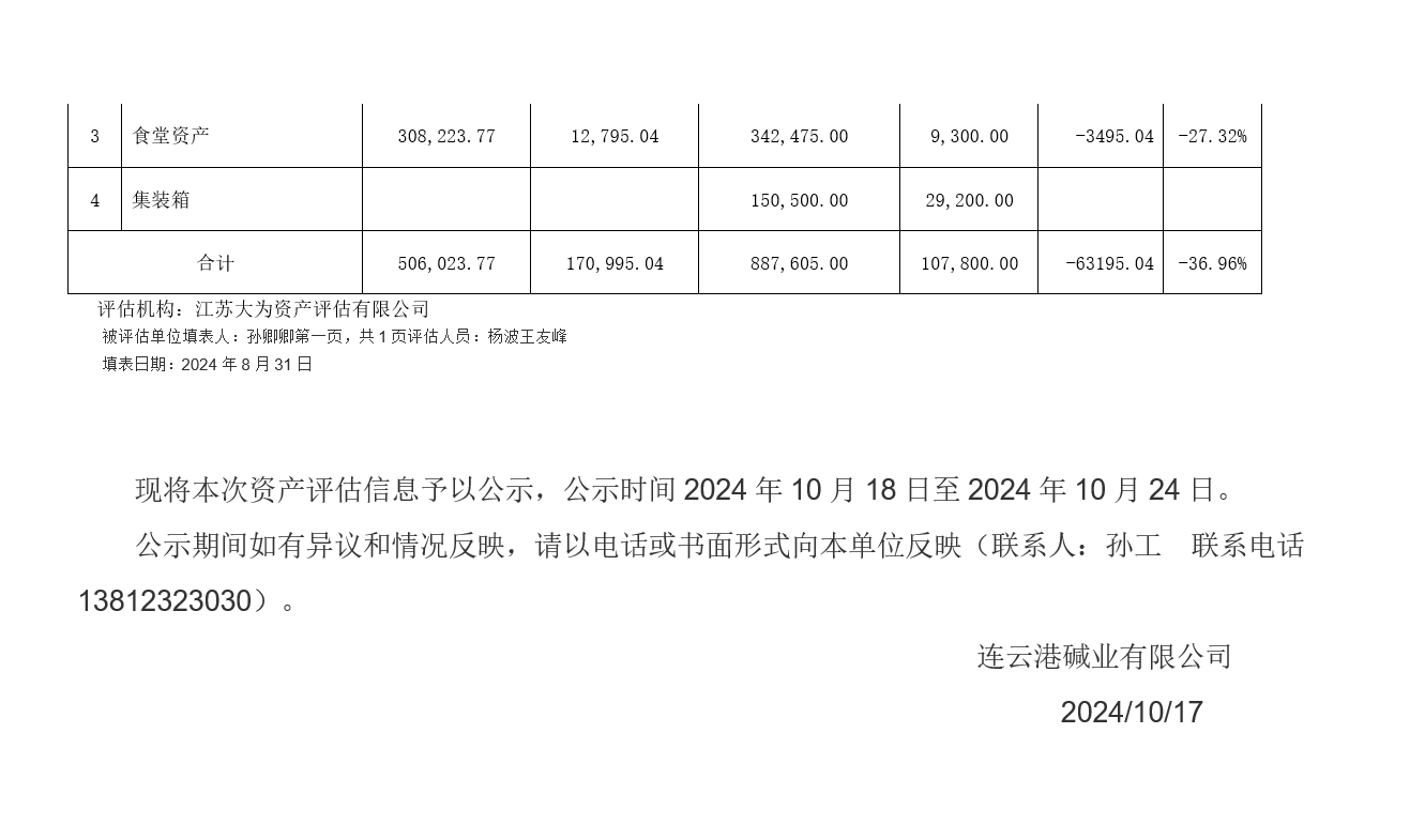 連云港堿業(yè)有限公司老廠(chǎng)區食堂等廢舊物資資產(chǎn)評估公示